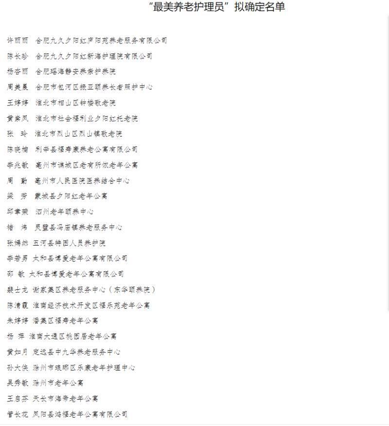 安徽省民政厅在2022年组织的寻找“***美养老护理员”活动,经县级申报、市级审核、网络投票、zj****评审、会议研究等程序,安徽省评选出50名养老护理员为“***美养老护理员”,我院王启芬护理员当选“安徽省***美养老护理员”荣誉称号。
